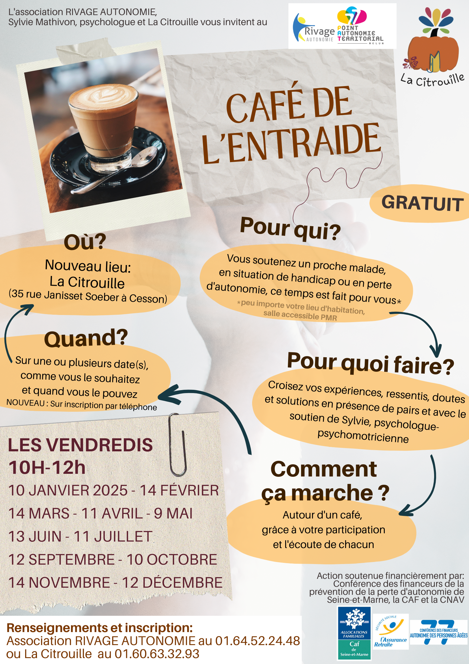 Le café de l’entraide vous est proposé par l’association RIVAGE AUTONOMIE de Melun et La Citrouille de Cesson/Vert-Saint-Denis